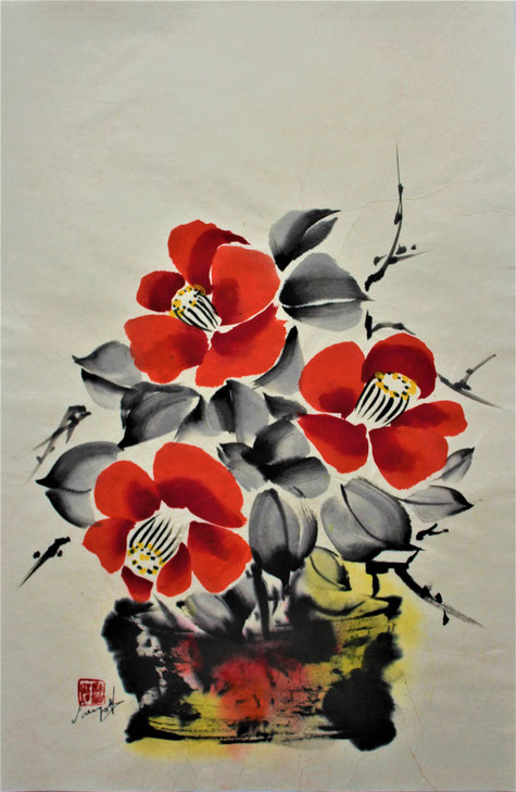 Das Gemälde ist von der Künstlerin mit Namen und ihrem persönlichen roten Stempel unten links in der Vorderseite signiert.