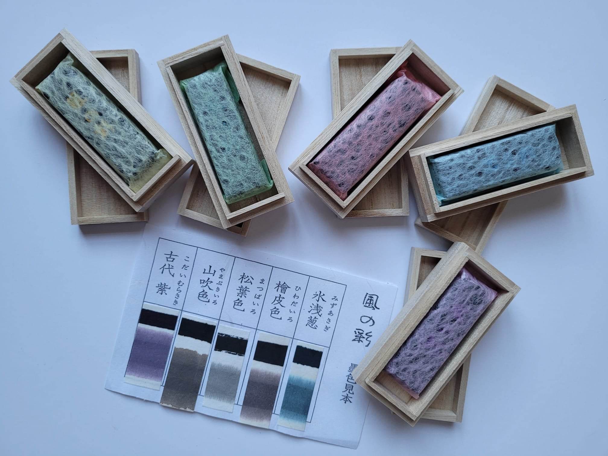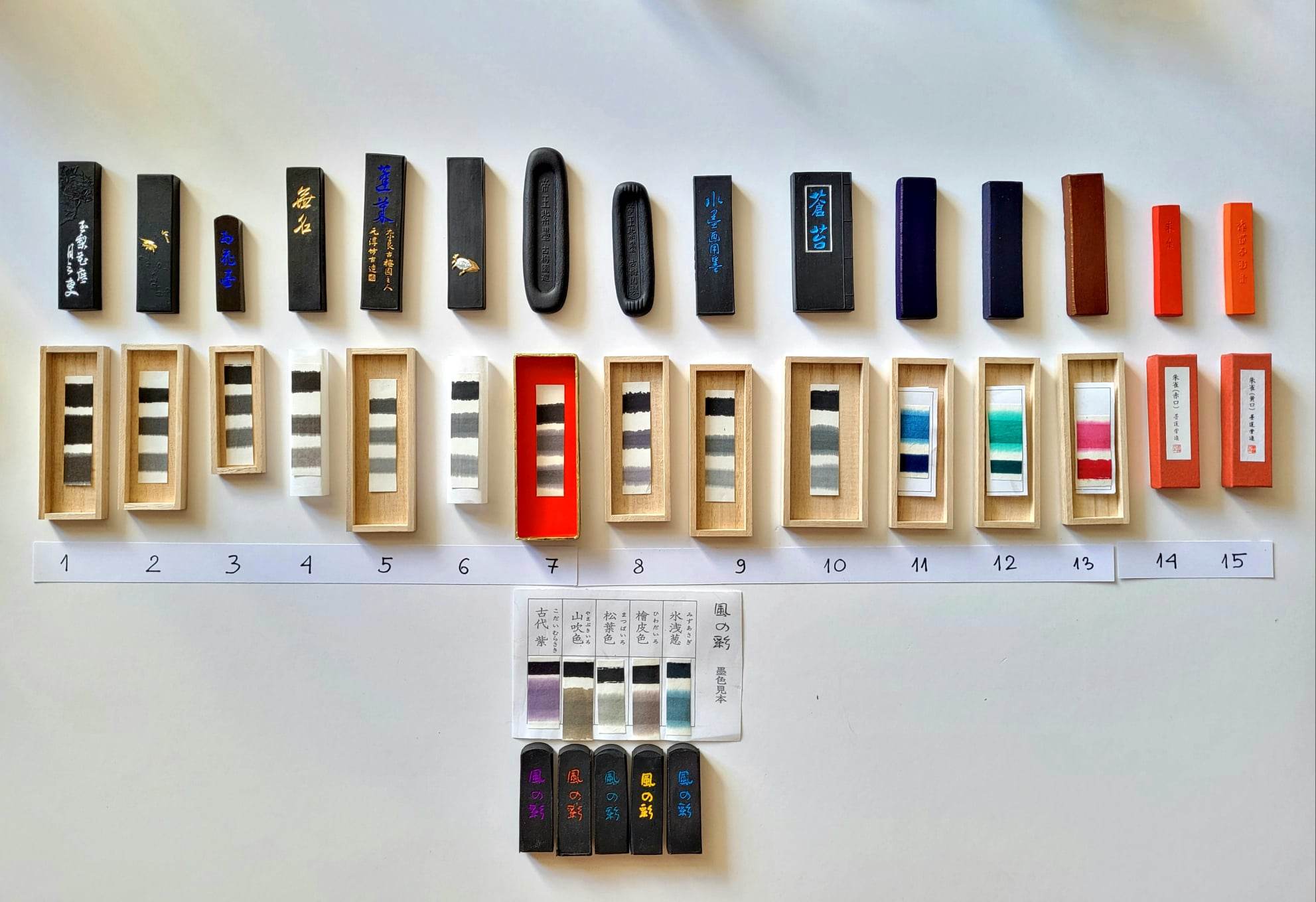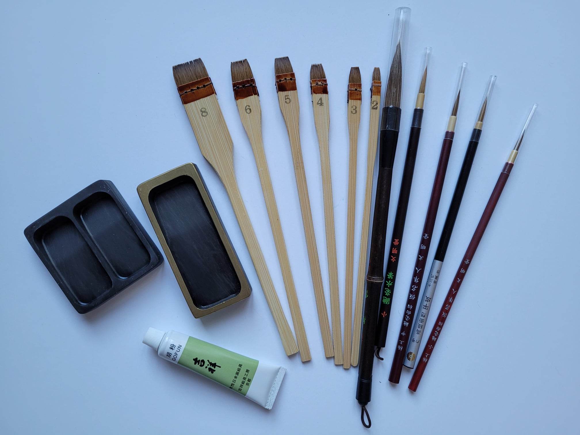 Im Präsenzunterricht sind sämtliche hochwertigen Materialien im Kurspreis inbegriffen: traditionelle japanische Tusche, Reibstein Suzuri, Papier sowie ausgewählte japanische Pinsel. Zusätzlich erhalten die Teilnehmenden sorgfältig vorbereitete Vorlagen und technische Übungsblätter – wahlweise in gedruckter Form.